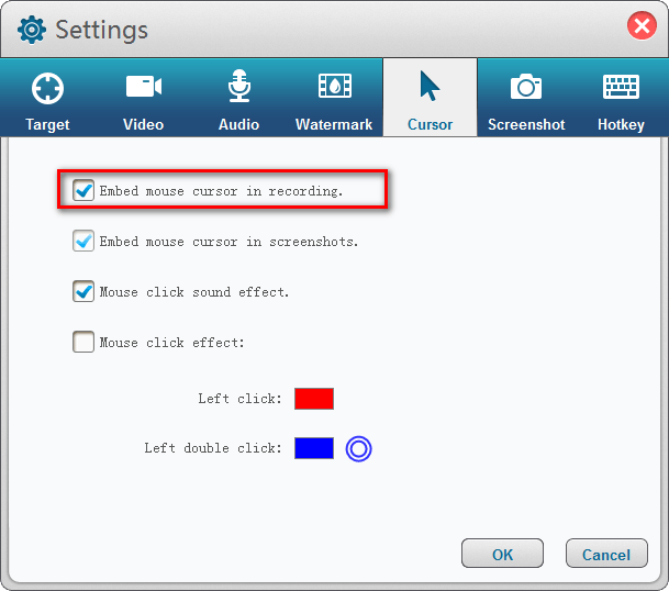 You can enable or disable capturing the mouse cursor in "Settings", just go the the "Cursor", and select or deselect the "Embed mouse cursur in recording".