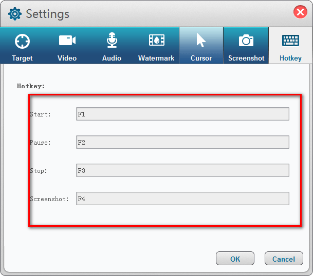 The default hotkey is showing as follows, you can change the hotkeys according to your own needs.