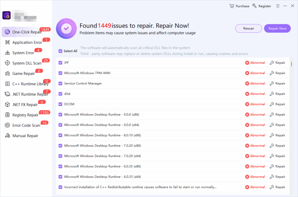 • System DLL Scan: Scans for missing or corrupted system DLL files to ensure normal operation of program-dependent components;